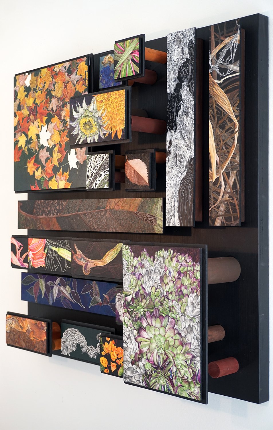 ROOTED IN NATURE Scratchbord® with Colored Inks and Acrylic Paint 30”x30”x7” Eighteen Separate Boards Mounted at Different Depths. 2025